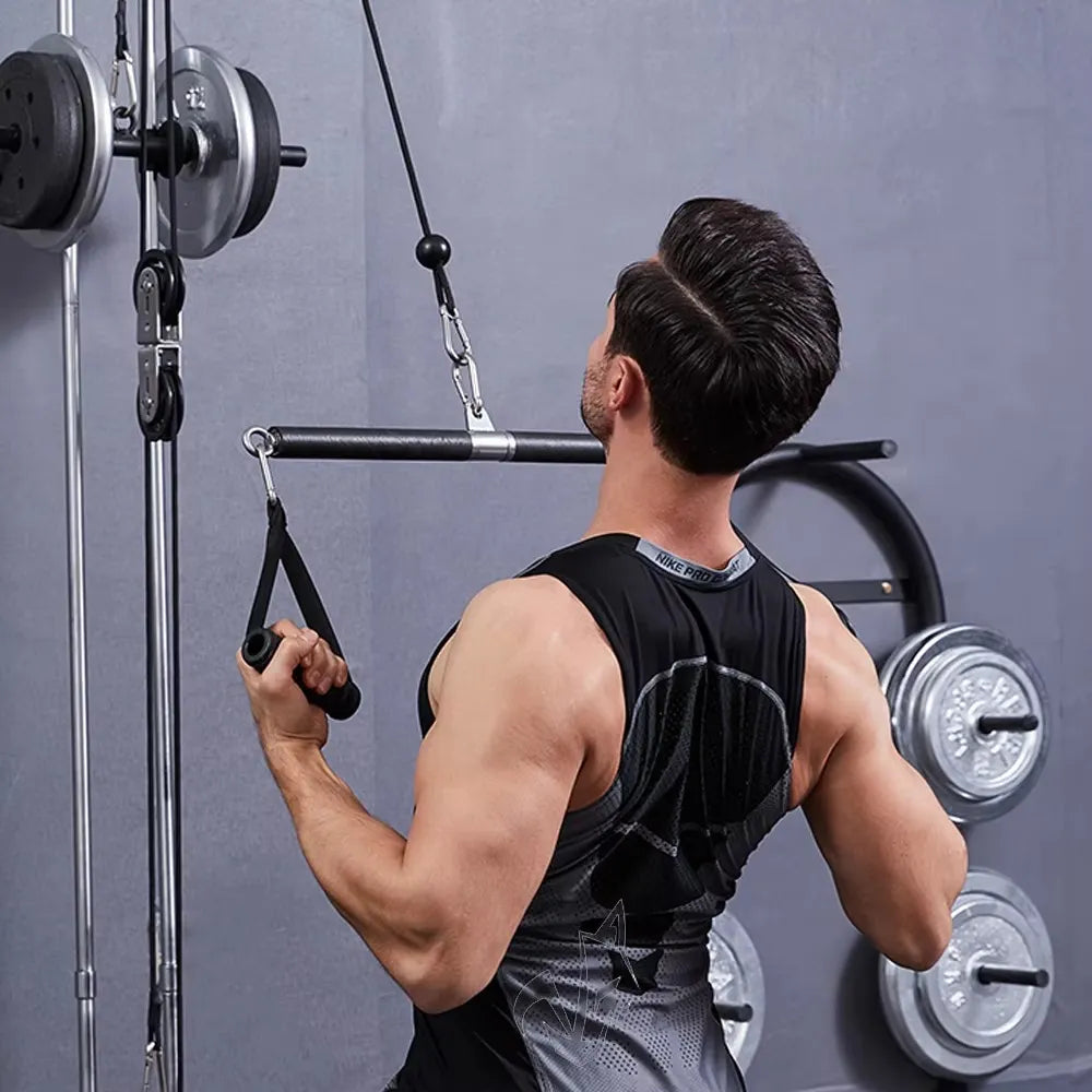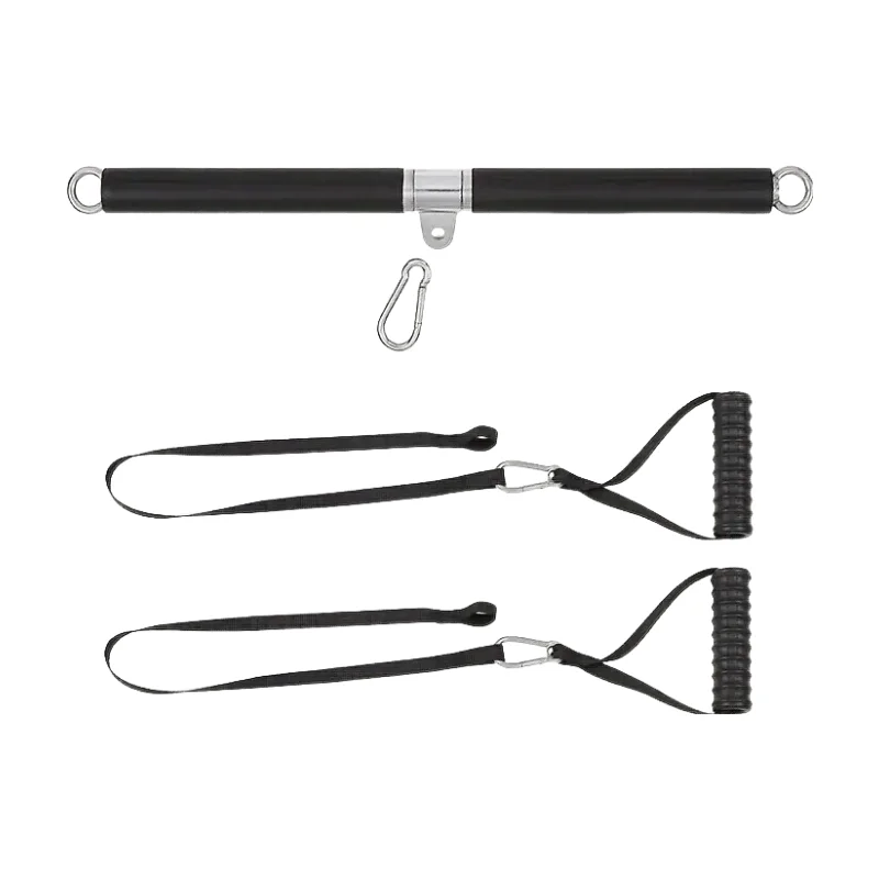 Barras e alças resistentes para costas, ombros e tríceps compatíveis com máquinas de musculação e sistemas de cabos.