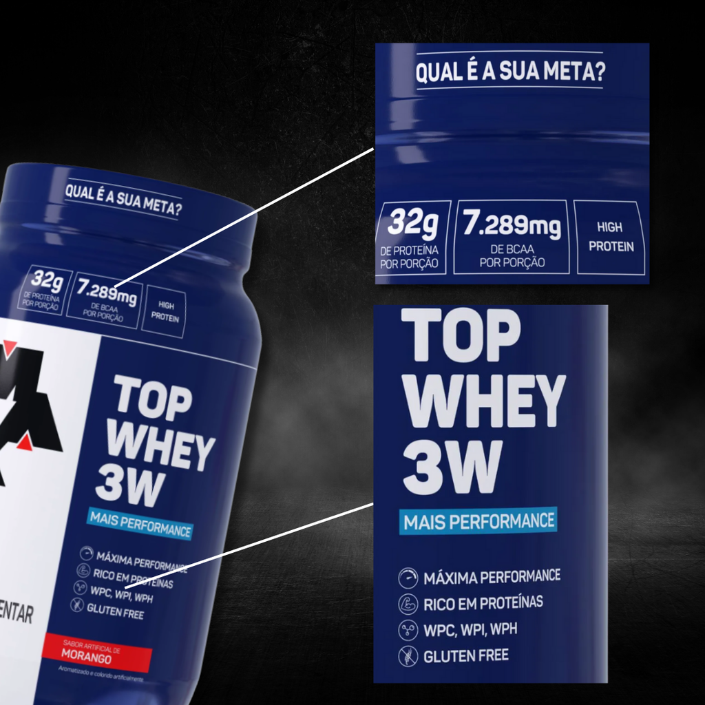 Top Whey 3 W + Performance : a linha oferece de 31 a 32g de proteínas por porção, garantindo um aporte de BCAAs e Leucina em altas concentrações. Contém em média 4g de Carboidratos na dose e apresenta um mix de vitaminas e minerais, que irão de ajudar a melhorar ainda mais os seus resultados!